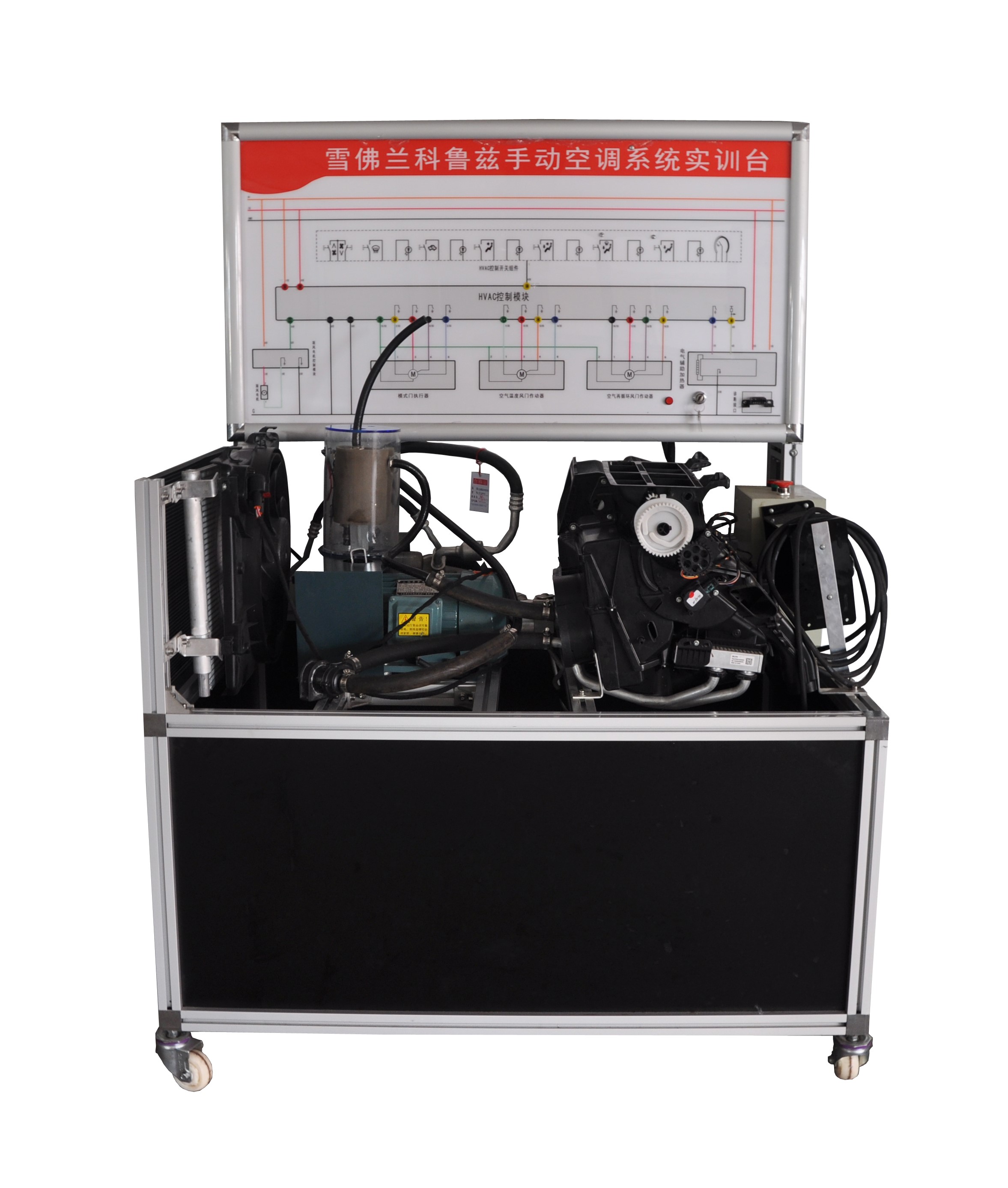 3.實(shí)訓(xùn)臺(tái)面板上繪有彩色噴繪空調(diào)電路圖和原理圖,噴繪圖由有機(jī)玻璃保護(hù)。四周由不銹鋼鑲邊,由有機(jī)玻璃板保護(hù),學(xué)員可直觀對(duì)照電路圖和實(shí)物,認(rèn)識(shí)和分析汽車手動(dòng)空調(diào)系統(tǒng)的工作原理;