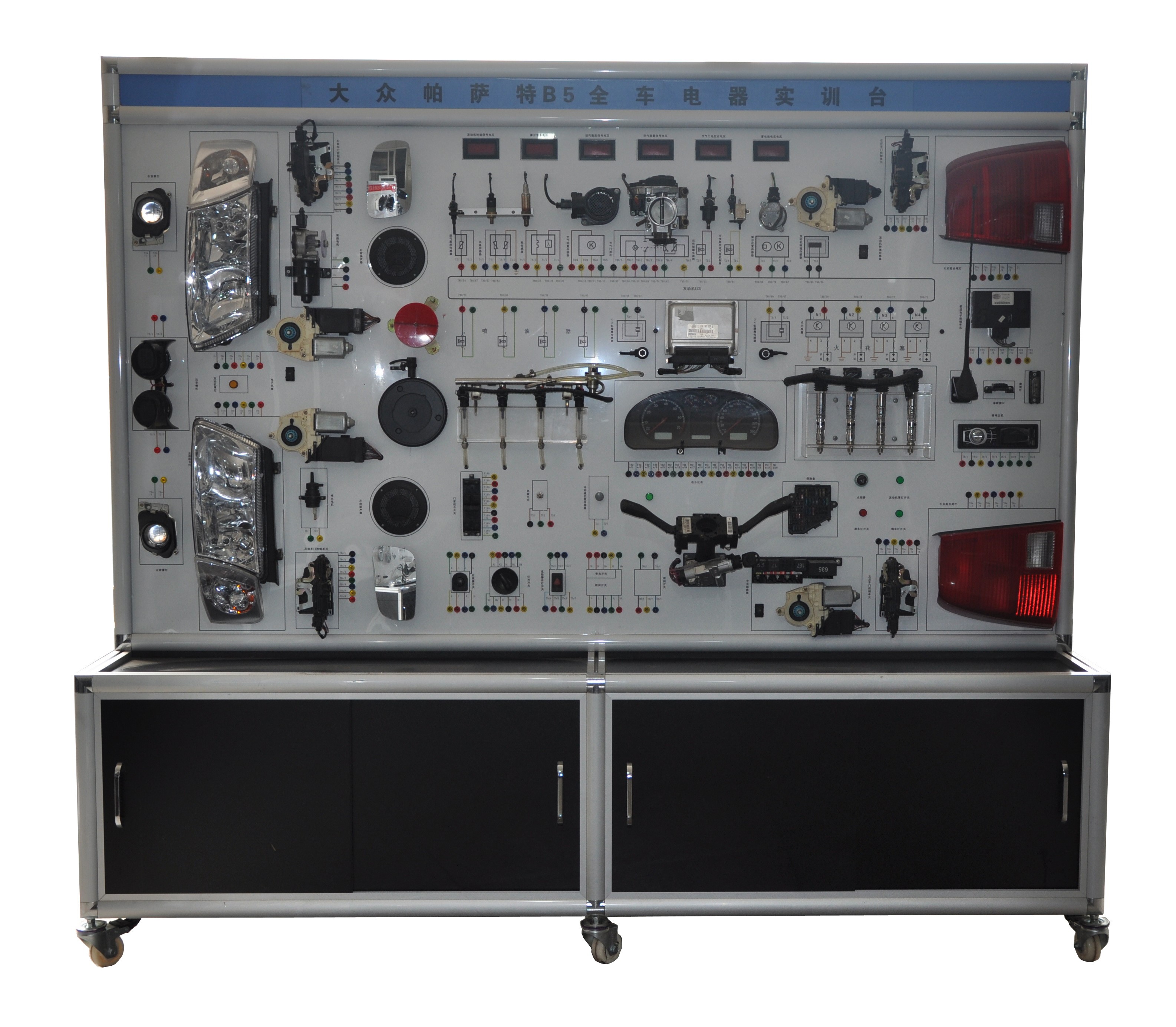 6、測量面板:實(shí)訓(xùn)臺面板上分布全車電氣系統(tǒng)線路圖和150個(gè)以上的4mm測量端子,便于檢測;變慢上安裝的電流表或電壓表用于指示傳感器或執(zhí)行器的參數(shù);通過萬用表或式波器實(shí)時(shí)檢測各電路元件的電壓、電阻、頻率或波形