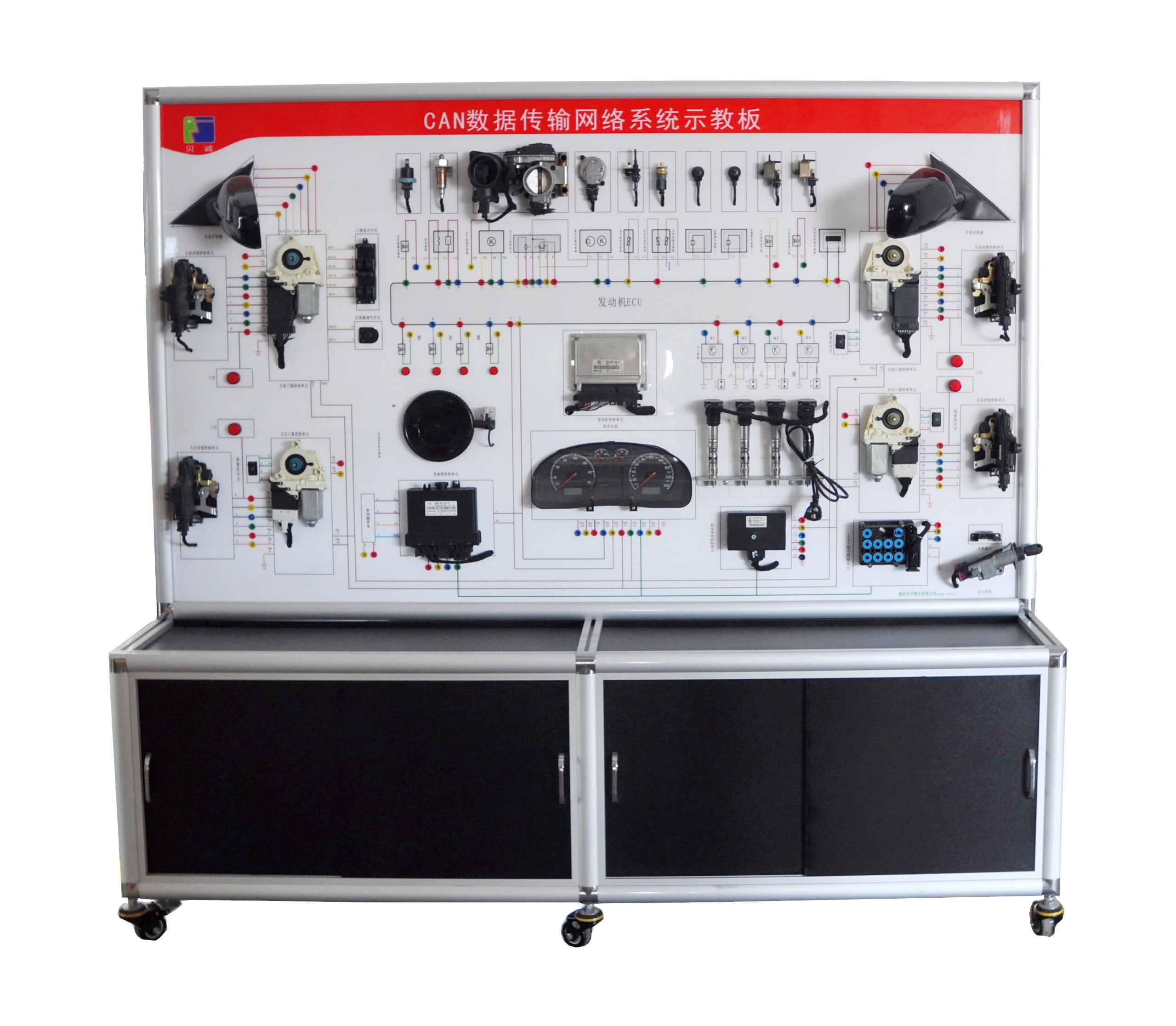 3、設(shè)備具備診斷連接功能,可聽過汽車故障診斷儀對整個示教板東西系統(tǒng)和舒適系統(tǒng)的CAN數(shù)據(jù)傳輸網(wǎng)絡(luò)及終端控制單元進行檢測